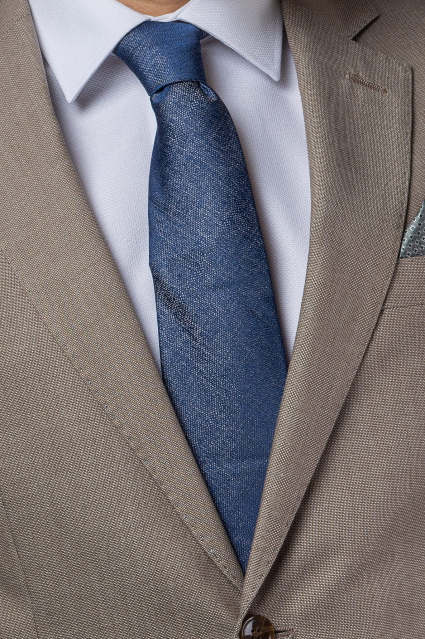 A zakó karcsúsított szabású, kétgombos záródással, klasszikus normál gallérral és dupla sliccel készült, ami optimális mozgásszabadságot biztosít. Elöl két egyenes zsebbel és egy mellzsebbel rendelkezik. Az ujjakon négy, egymást átfedő gomb sorakozik, melyek színe megegyezik a zakó gombjaival, egy matt barna árnyalatot képviselve. A mellény öt gombbal záródik, két apró paszpólos zsebbel, V-nyakú kivágással, tökéletesen illeszkedve az öltöny anyagához és színéhez. A nadrág elöl sima, övhurkokkal ellátott, szintén egyenes zsebekkel, és letisztult, felhajtás nélküli szárral végződik. Az anyag finom, matt textúrájú, ami a bézs színnel együtt egy nagyon sokoldalú és elegáns megjelenést kölcsönöz.