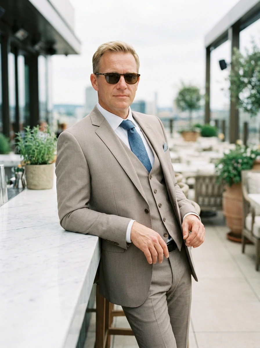 A bézs öltöny kiváló választás nyári eseményekre. Párosítsd egy világoskék, lenvászon inggel, amit nyugodtan viselhetsz nyakkendő nélkül, lazán kigombolva. Egy pasztellszínű, mintás zsebkendővel és a képen látható barna loafer cipővel könnyed, mégis elegáns szettet kapsz, ami kényelmes a melegebb időben is.
