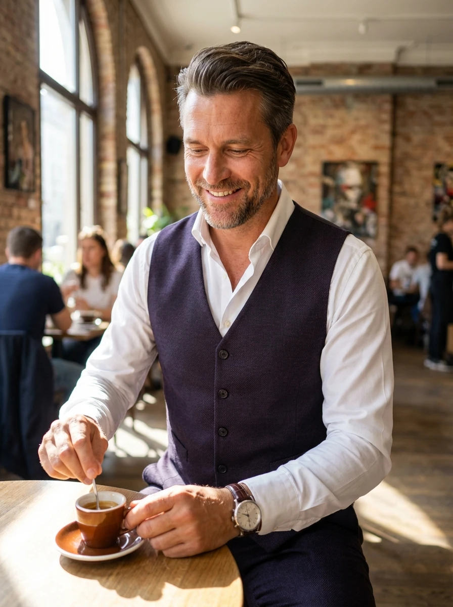 Válassz hozzá egy klasszikus fehér, mandzsettás inget, nyakkendő nélkül, a felső két gombot kigombolva, ahogy a képen is látható. Egy sötétbarna bőr loafer vagy derby cipővel és egy hozzáillő, egyszerű bőrövvel párosítva a megjelenés egyszerre lesz professzionális és lezseren elegáns. A mellény viselése extra réteget és komolyságot ad. -