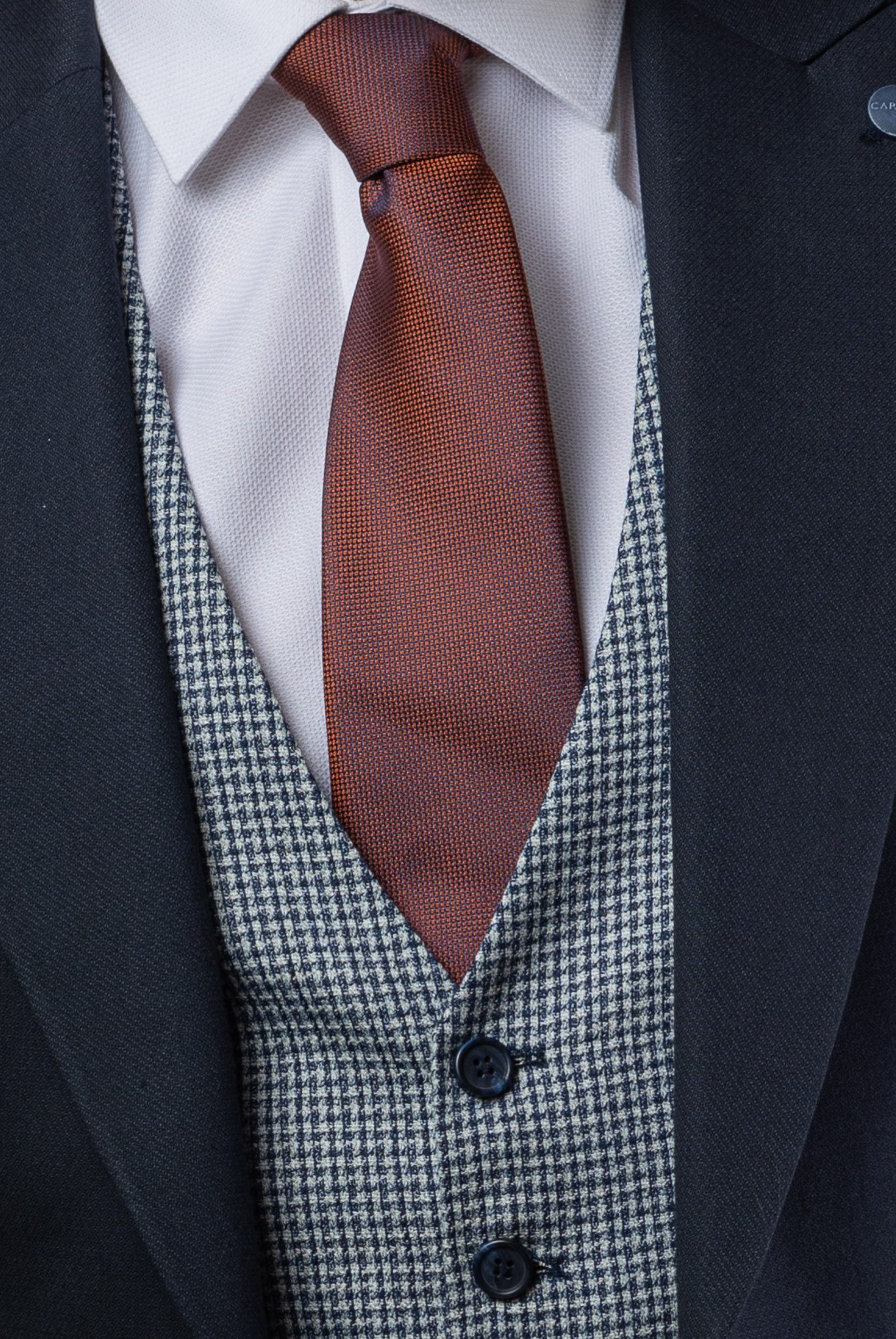 A háromrészes öltöny szerves része a szürke alapon apró pepita mintázatú mellény, mely ötgombos záródással és V-nyakkal rendelkezik. A nadrág a zakóval azonos éjkék anyagból készült, karcsúsított szabással és övtartó hurkokkal, míg a szettet kiegészítő sötétbordó nyakkendő és barna, texturált bőr öv tovább emeli az összképet.
