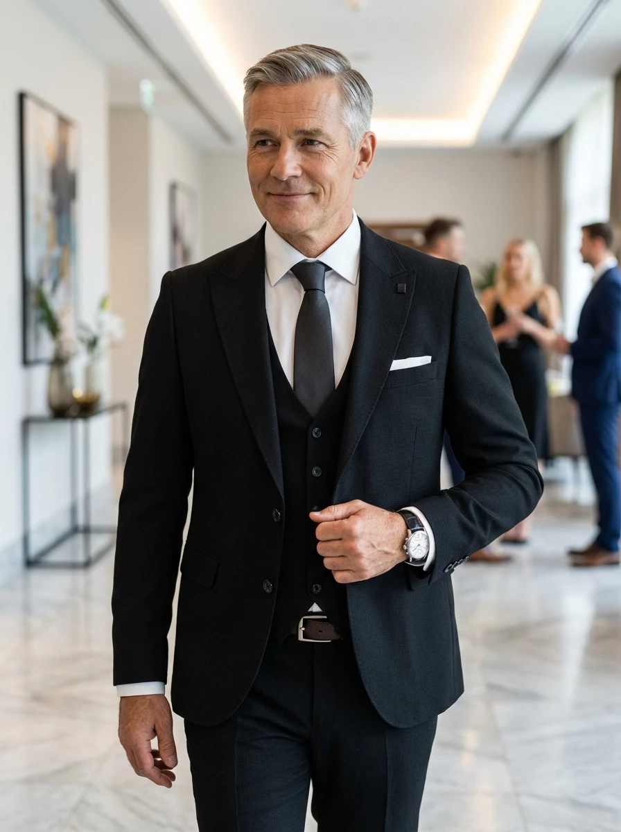 Ez a fekete, háromrészes slim öltöny azonnal feltűnik letisztult matt fekete színével és precízen szabott vonalaival. A finom tapintású anyaga – ahogy a képen is látszik – nem csillog, hanem elegánsan elnyeli a fényt, ezzel kölcsönözve visszafogott, mégis modern megjelenést. A karcsúsított szabás és a mellény harmonikus egységet alkot, ami már az első pillantásra is igényes benyomást kelt.