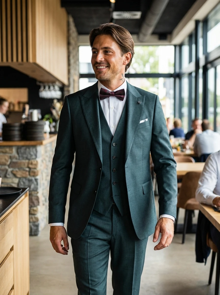 Ez a fenyőzöld háromrészes slim öltöny azoknak a férfiaknak készült, akik a hagyományos színek mellett valami egyedibbre vágynak, de nem akarnak kompromisszumot kötni az elegancia terén. Ideális választás, ha a munkád megköveteli az öltönyös megjelenést, de szeretnéd kifejezni a személyiségedet egy különleges árnyalattal. Kifejezetten ajánlott azoknak, akik fontosnak tartják, hogy a megjelenésük egyszerre legyen modern, stílusos és emlékezetes.