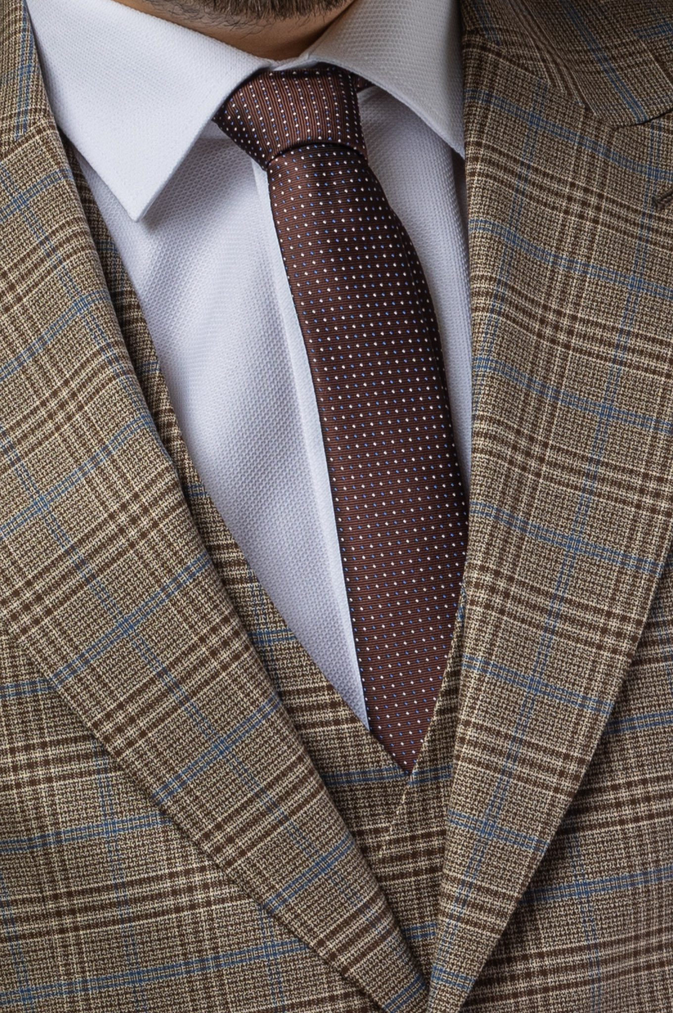 A zakó kétgombos záródású, klasszikus bevágott gallérral rendelkezik, melynek szélessége optimális az arányos megjelenéshez. Két egyenes fedlappal ellátott zseb és egy csónak alakú mellzseb található rajta, melyben egy sötétkék-bordó mintás zsebkendő kapott helyet. Az ujjak mandzsettáját négy, egymással érintkező, sötétbarna gomb díszíti, melyek finoman kiemelik a kézműves kidolgozást. A nadrág letisztult, slim fit szabású, rejtett záródással és éles vasalási éllel, ami optikailag nyújtja az alakot. A mellény öt gombbal záródik, V-nyakú kivágású és két apró, paszpólos zsebbel készült. Az öltöny anyagának textúrája finom, de mégis jól látható, ami mélységet ad a mogyoróbarna alapszínnek és a kockás mintázatnak.