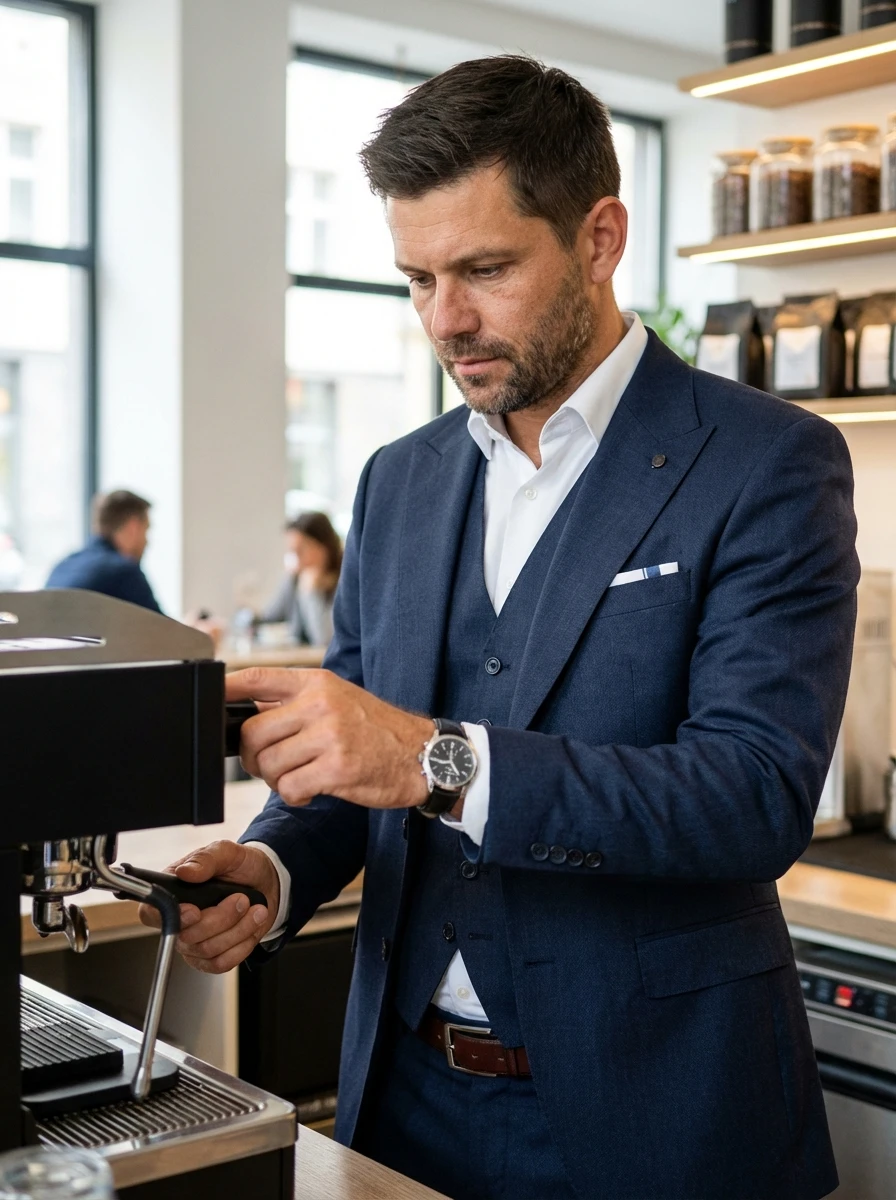 Ez a parlamentkék háromrészes öltöny számos apró részlettel emelkedik ki. A zakó kétgombos, karcsúsított szabású, klasszikus bevágott gallérral és két egyenes zsebbel, melyek hajtókával záródnak. A mandzsettán négy barna, enyhén fényes gomb található, melyek diszkrét eleganciát adnak. A mellény ötgombos, egyenes vonalú, alul enyhén kihegyezett. Az öltönyhöz viselt nadrág egyenes szabású, elől ránc nélküli. Az anyag finom, szinte észrevehetetlen textúrájú, ami a mély parlamentkék árnyalatnak különleges mélységet és tartást kölcsönöz. A képen látható összeállításban egy borvörös, kötött nyakkendő és egy fehér, borvörös szegélyű zsebkendő egészíti ki az öltönyt, barna bőr oxford cipővel és egy elegáns, barna szíjas karórával párosítva.