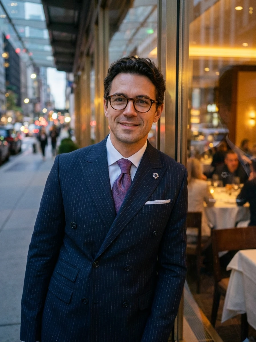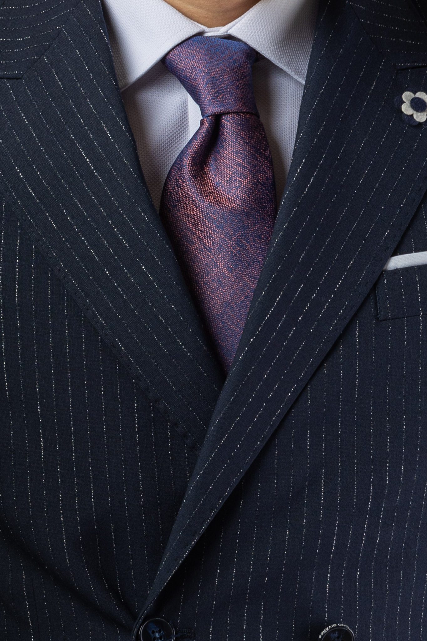A sötétkék csíkos slim öltöny zakója kétsoros gombolású, hat sötétkék, enyhén fényes gombbal záródik, melyek közül kettő láthatóan funkcionális. Széles, csúcsos reverje markáns karaktert ad az öltönynek, amit a bal oldali mellzsebből kikandikáló hófehér díszzsebkendő tesz teljessé. A két egyenes paszpólos zseb letisztult megjelenést biztosít, míg az ujjakat négy sötét gomb díszíti, melyek illeszkednek a fő gomboláshoz.