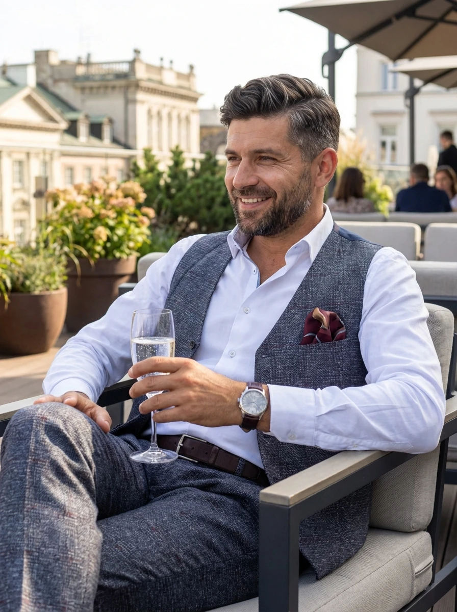 A mellényt viseld önmagában, a zakó nélkül, egy sötétszürke vagy sötétkék, puha tapintású garbóval. A nadrághoz választhatsz egy mokaszin típusú, sötétbarna velúr cipőt, nyakkendő helyett pedig egy finom selyem zsebkendőt a mellényzsebbe. Ez a kombináció egyszerre elegáns és kényelmes, tökéletes egy esti programra.