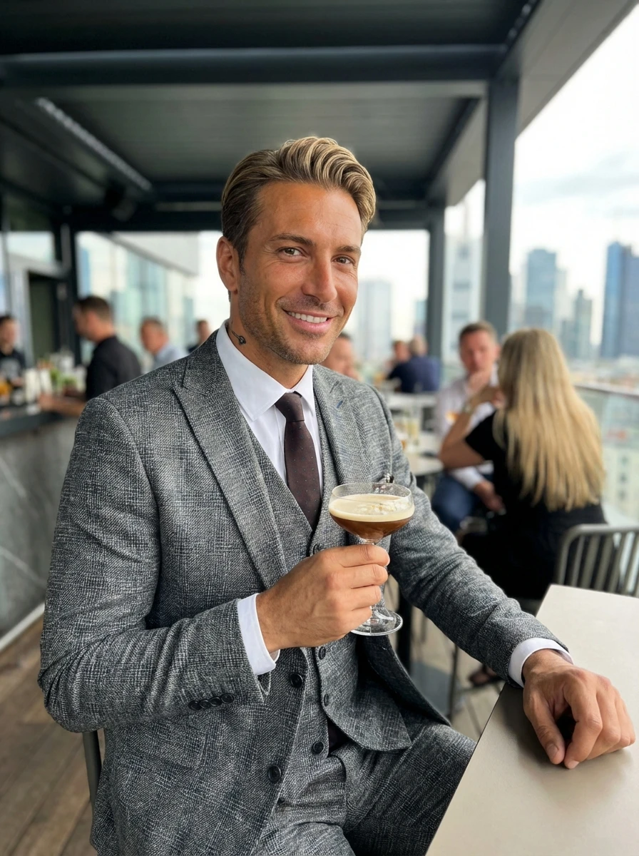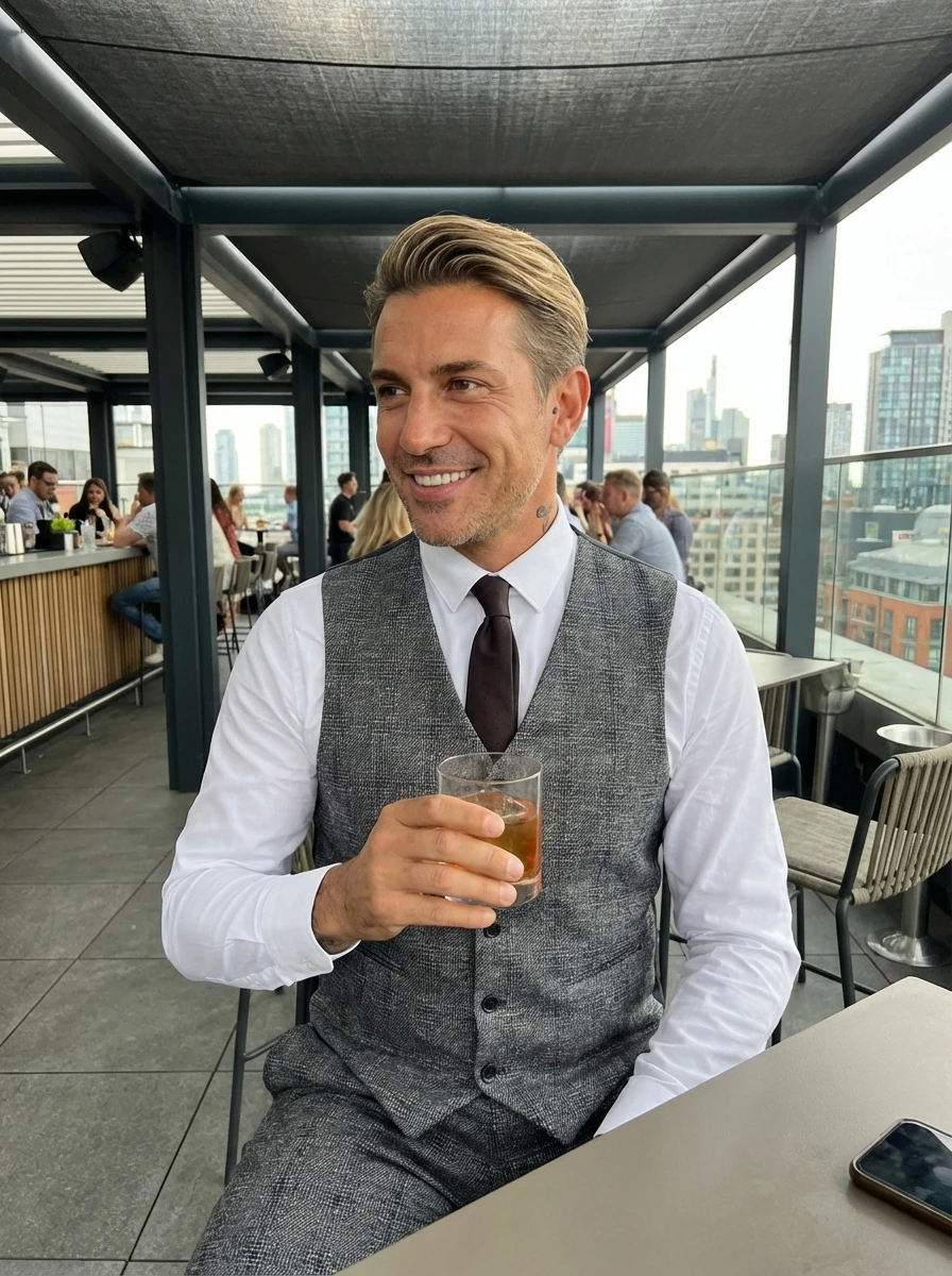 Viseld az öltönyt mellénnyel, de hagyd el a nyakkendőt. Vegyél alá egy világoskék, finom mintás inget, melynek felső gombjait lazán kigombolod. Egy sötétbarna velúr loafer cipővel és egy elegáns karórával máris megvan a tökéletes, lezseren elegáns szett, ami ideális egy különleges esti programhoz.