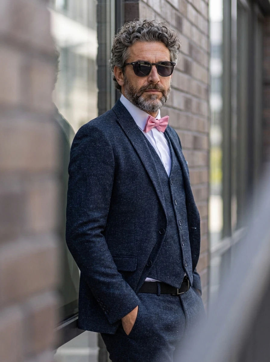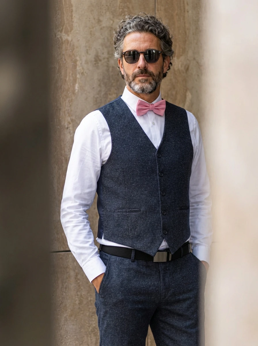 A zakó klasszikus szabású, két gombos záródású, finom bevágott gallérral, melynek szélessége körülbelül 7-8 centiméter. Két egyenes zsebfedős zseb található rajta, valamint egy mellzseb, ahonnan a fehér díszzsebkendő elegánsan kikandikál. A mandzsettákon négy sötét, matt gomb sorakozik, míg a zakó hátán a dupla slicc modern megjelenést és mozgásszabadságot biztosít. A mellény öt gombbal záródik, a felső gombot diszkréten takarja a zakó, és két finom paszpólzseb egészíti ki. A nadrág letisztult, egyenes szabású, övtartókkal, fekete bőr övvel és sötét, fűzős bőrcipővel viselve.