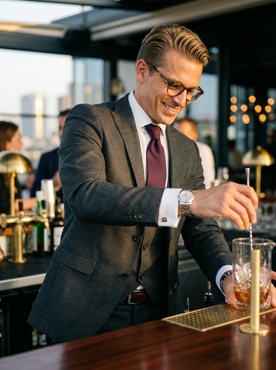 A teljes háromrészes öltönyhöz válassz egy hófehér, dupla mandzsettás inget, amit mandzsettagombbal zársz. Egy mélybordó selyem nyakkendővel és egy fényes, sötétbarna double monk strap cipővel az elegancia garantált. Ne feledkezz meg egy finom csokornyakkendőről sem, ha az alkalom megkívánja.