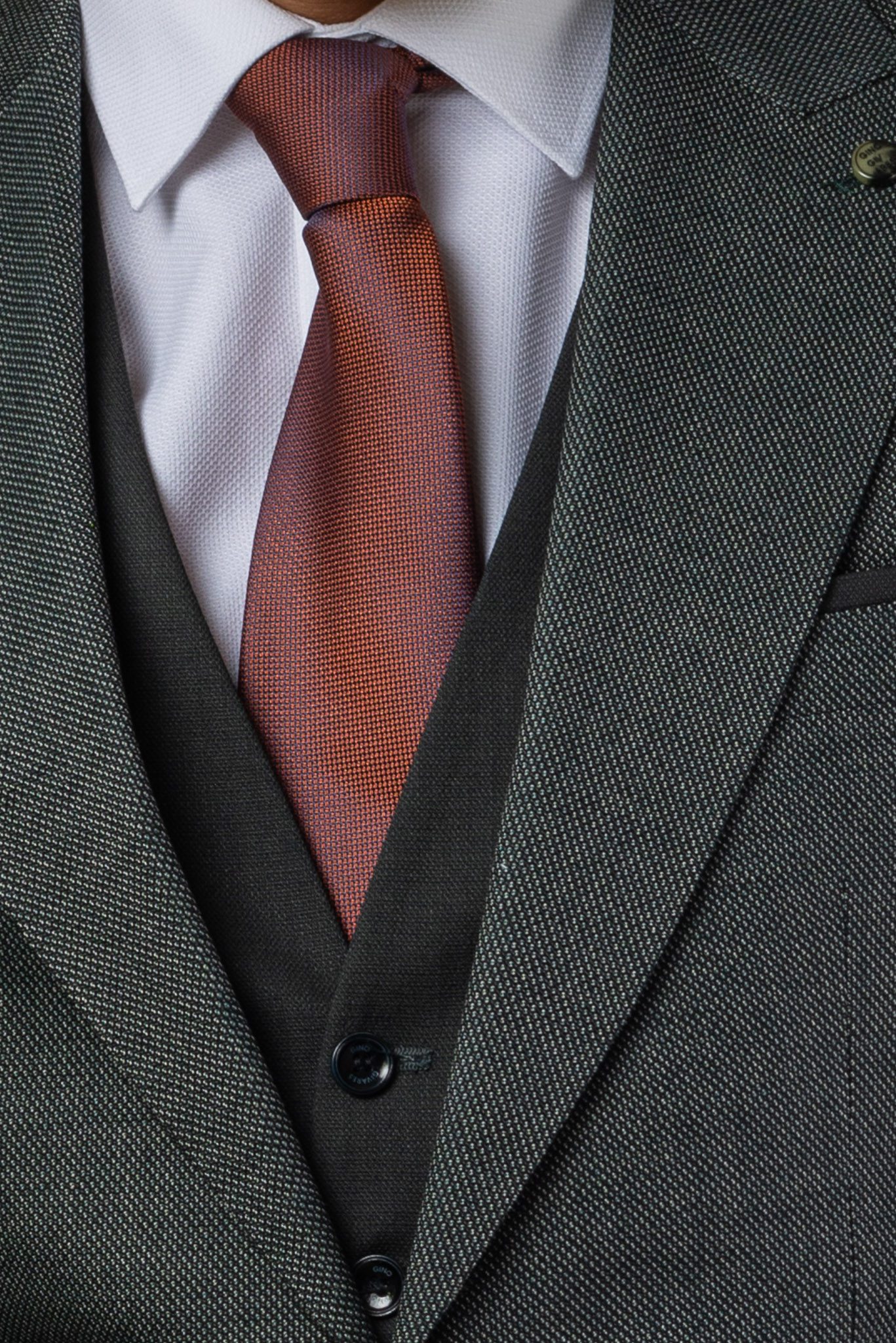 A zakó egysoros, kétgombos záródású, finoman ívelt noth lapellel, melynek szélessége arányos az öltöny karcsúsított vonalával. A mellkason egy csónak alakú zseb található, benne egy diszkrét, márkajelzés nélküli jelvény. Mindkét oldalon egy-egy hajtókás zseb helyezkedik el. Az ujjakon négy, egymáshoz simuló gomb díszíti a mandzsettát. A mellény öt gombbal záródik, mélyebb V-nyakkivágással, ami elegánsan engedi láttatni az inget és a nyakkendőt. A nadrág slim fit szabású, övhurkokkal, melyeken keresztül egy barna bőr öv simul, és enyhén megtörik a barna bőrcipő felett. A szövet felülete enyhén texturált, mintás, ami mélységet ad a sötétzöld színnek.